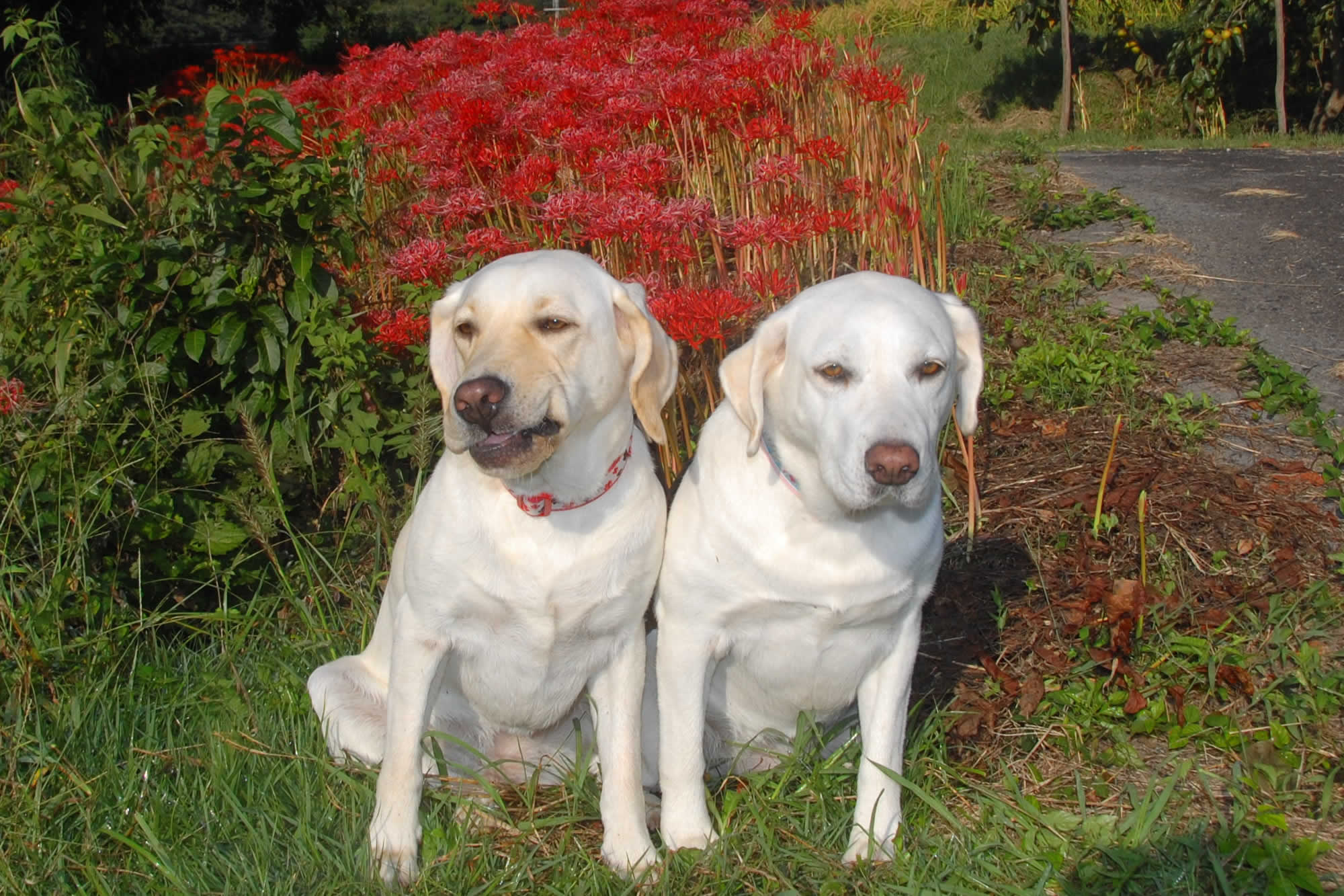 朝の散歩は、恒例の彼岸花の前で記念撮影。