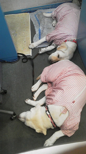 ワンコ達、僕の職場に来ている時は、店の一番奥にあるメガネの加工スペースの1メートル四方ほどの所にマットを敷いて寝かせています。