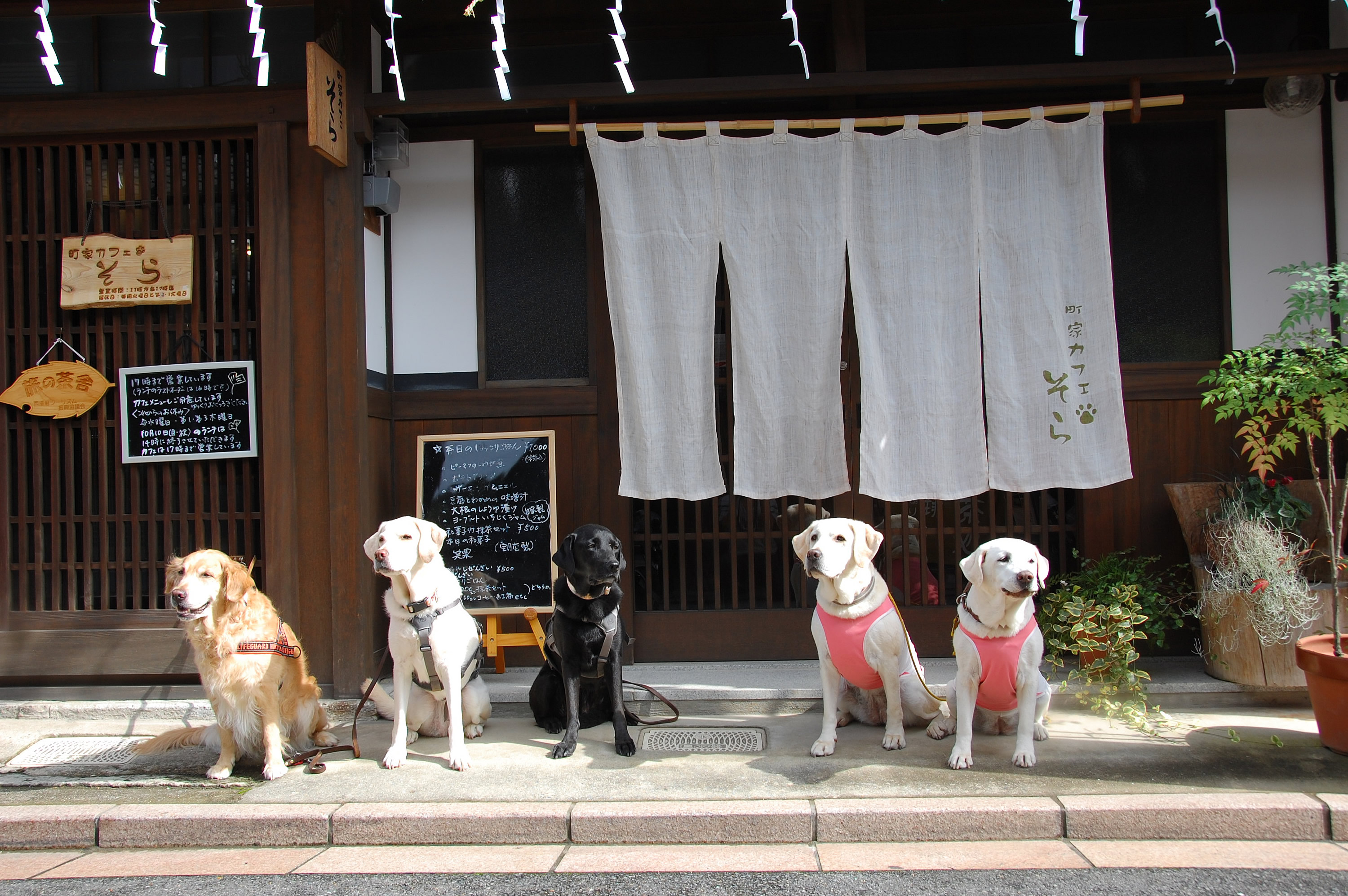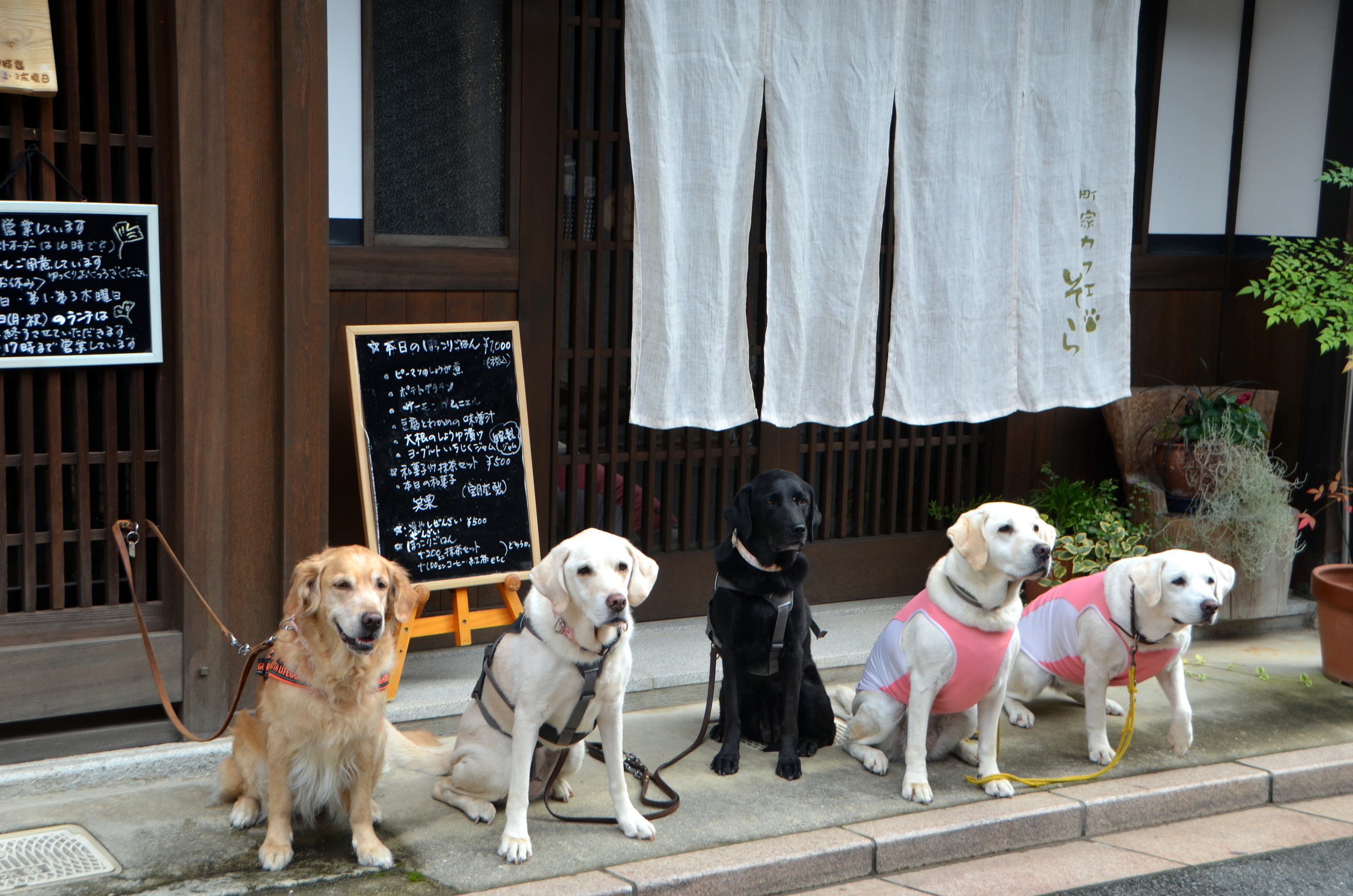 その後、"町家カフェそら"さんで5頭のワンコ達と一緒にランチ&記念撮影しました。