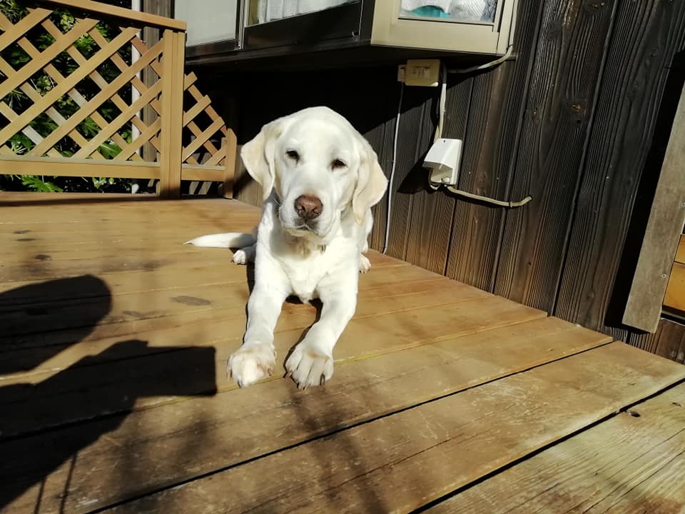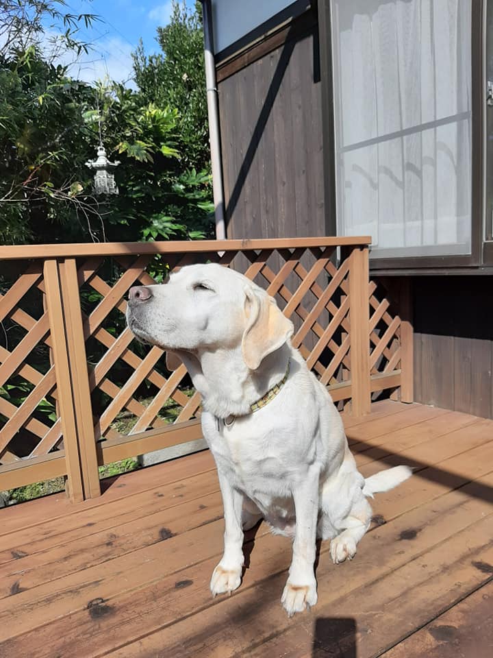 部屋を出て、ウッドデッキで日向ボッコのアズキです。