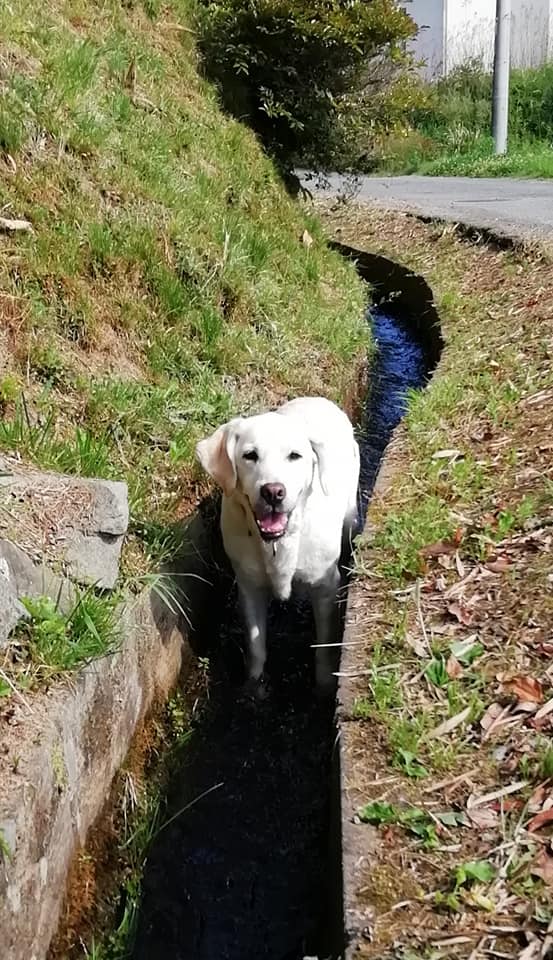 アズキは途中、溝へ入って水を飲みながら歩くのが日課です。