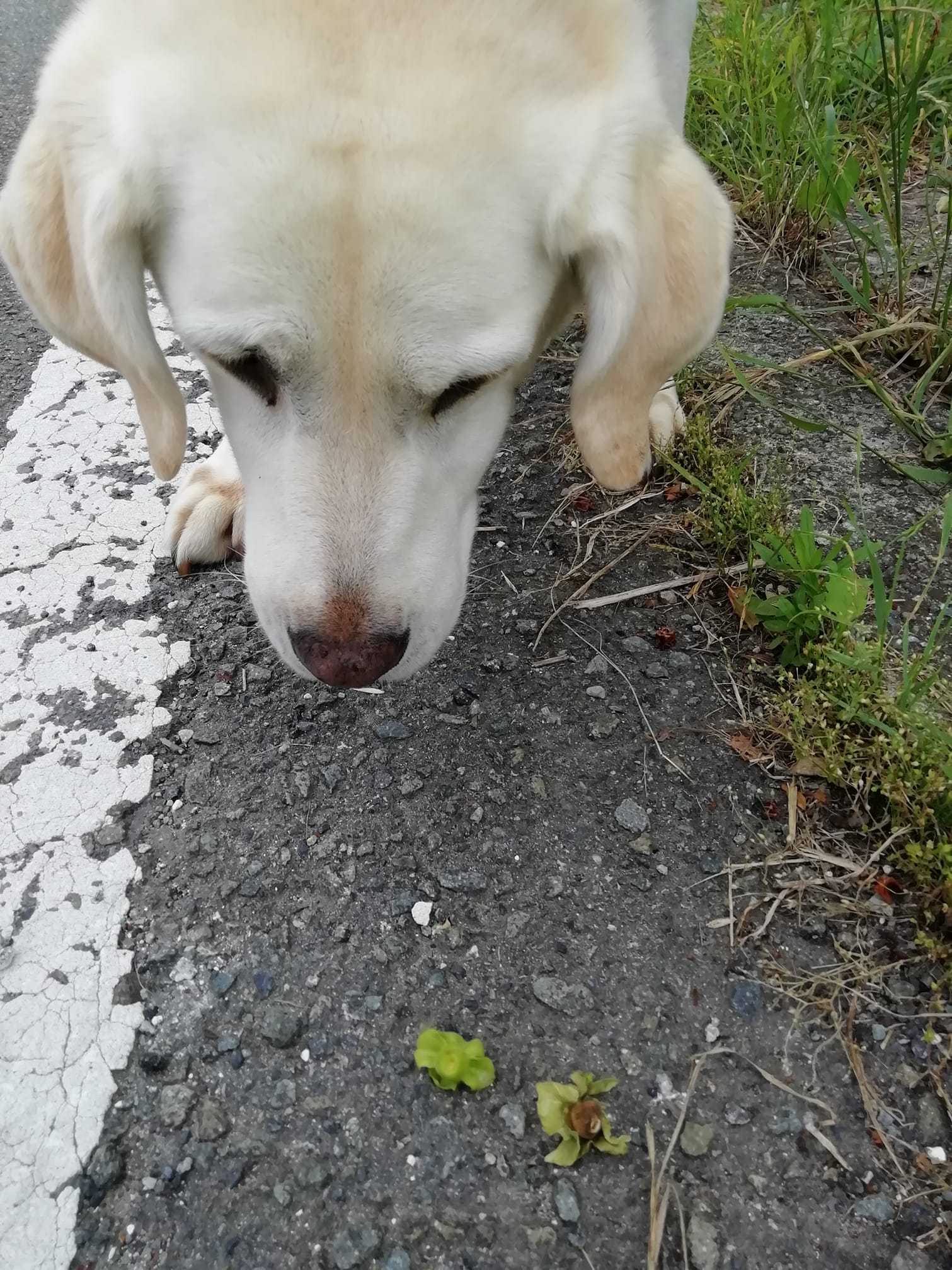 まだ小さくて、パチンコ玉よりも小さい程度の大きさですが、それを拾って食べます。アズキの目の前に2つある緑のがそれす。好物らしいですぅ