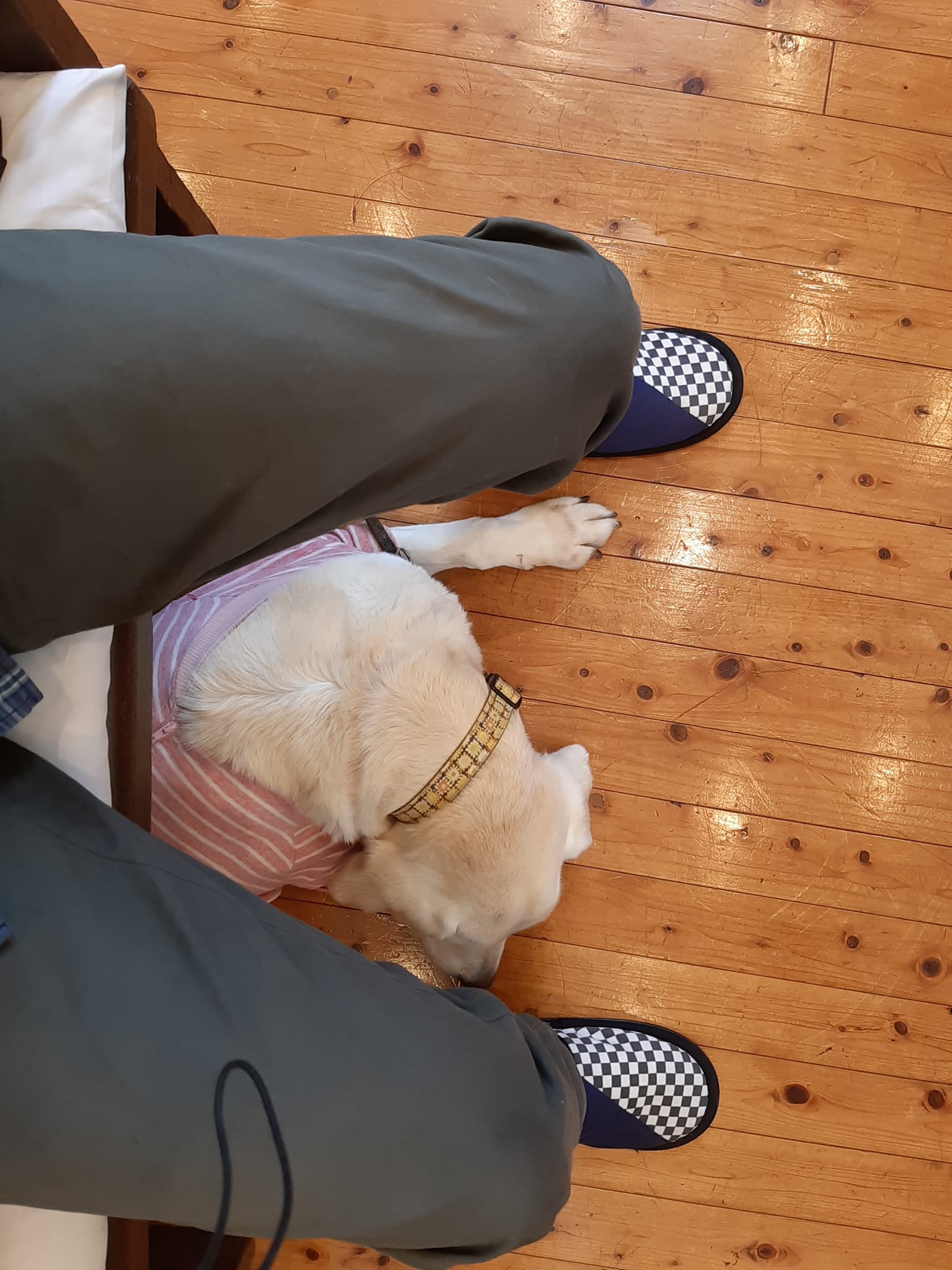 写真は、ベットの外からベットの縁を枕にして寝ているアズキです。