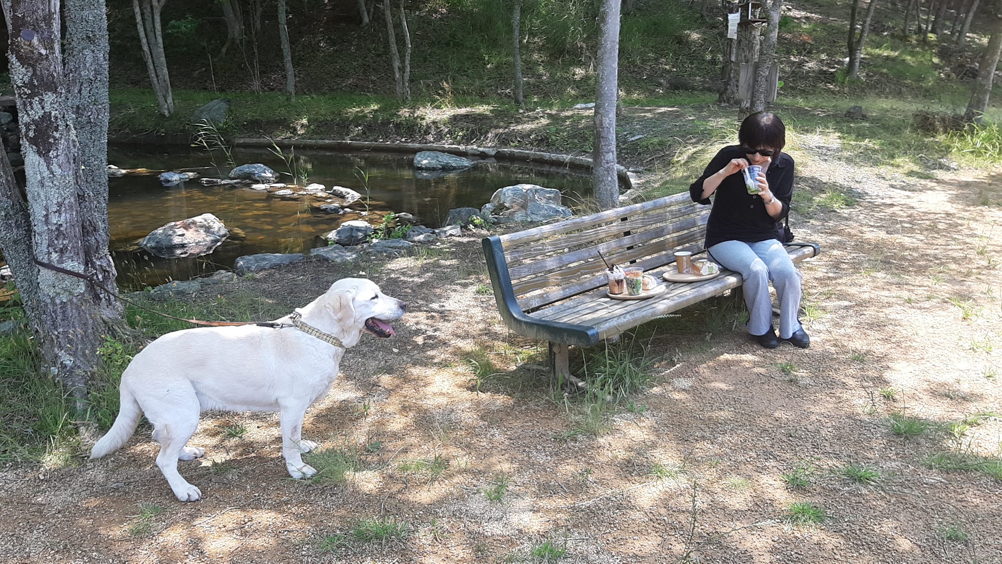 アズキも一緒に行って、裏側の木陰のベンチでいただいています。