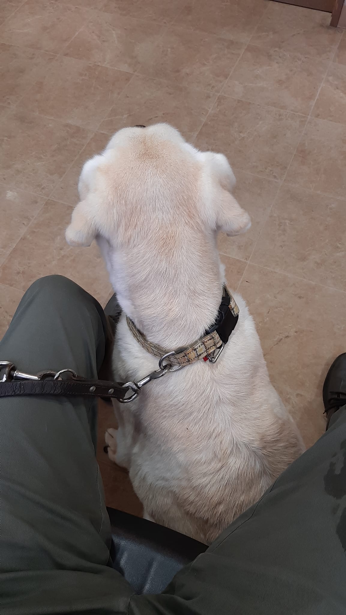 右に傾いてひっくり返りそうな待合室検査待ちのアズキです。